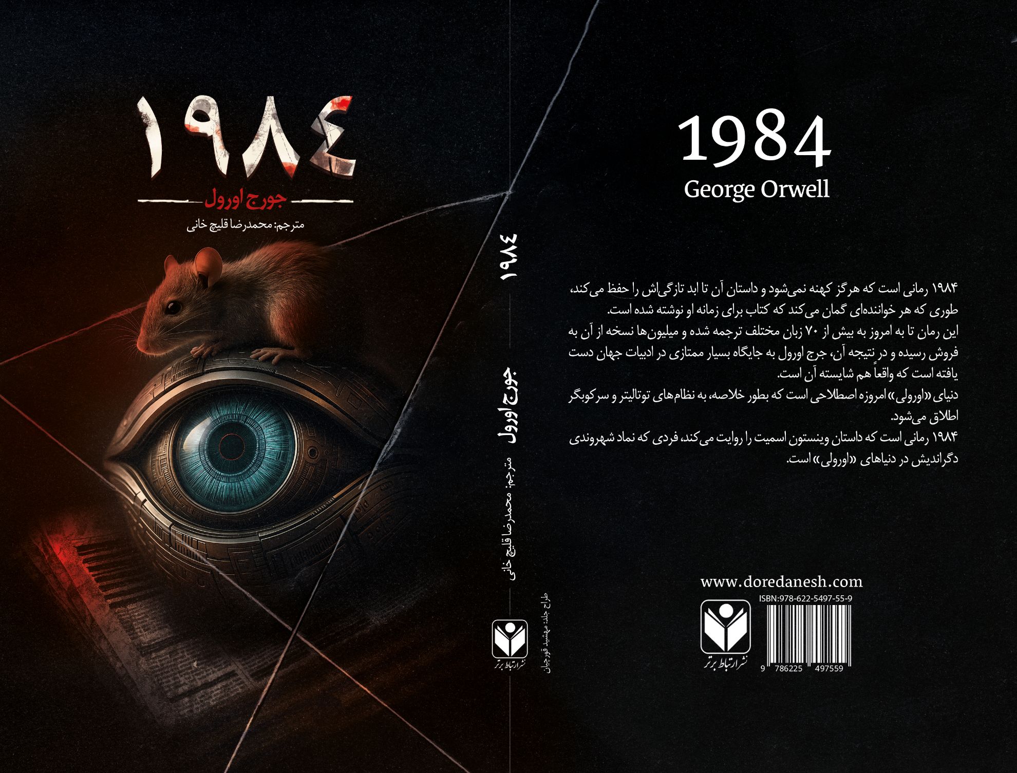 جلد رمان معروف «۱۹۸۴» را با نگاهی عمیق به مضمون کتاب طراحی کردم. نگاهی که که میان ترس، کنترل و واقعیتهای پنهان جهان اورولی حرکت میکند. در قسمت پایین و پسزمینه، روزنامههای چروکیده و جویدهشده نشانهای از حقیقتهای سانسورشده و اطلاعات تحریفشدهاند؛ همانگونه که در دنیای کتاب، جریان آزاد اندیشه در قید نظارت و ترس گرفتار است. در مرکز ترکیببندی، چشمی مکانیکی و سرد قرار دارد که حس کنترل و پایش مداوم مطبوعات و اذهان عمومی را القا میکند؛ این چشم استعارهای از «برادر بزرگ» است، نماد قدرتی که همهچیز را میبیند و هیچچیز از نگاهش پنهان نمیماند. بالای آن، موشی ایستاده است؛ موجودی کوچک اما جاسوسگونه که یادآور ابزارهای نفوذ و خبرچینی در نظامهای تمامیتخواه است.