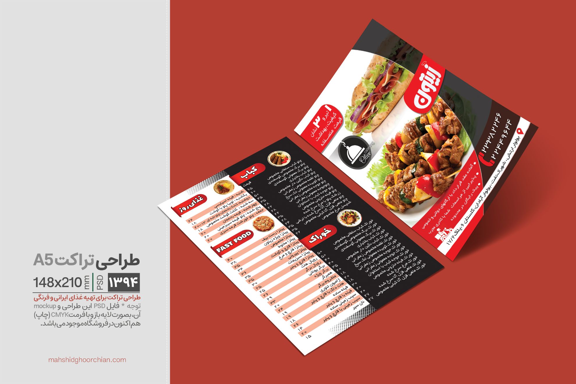 طراحی تراکتهای رستوران و کیترینگ توسط مهشید شامل سبکهای متنوع از طراحی مدرن و مینیمال گرفته تا طرحهای سنتی و رنگارنگ است که بهطور دقیق با هویت برند شما هماهنگ میشوند.